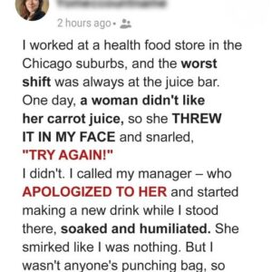 I worked at a health food store in the Chicago suburbs, and the worst shift was always at the juice bar. One day, a woman didn’t like…