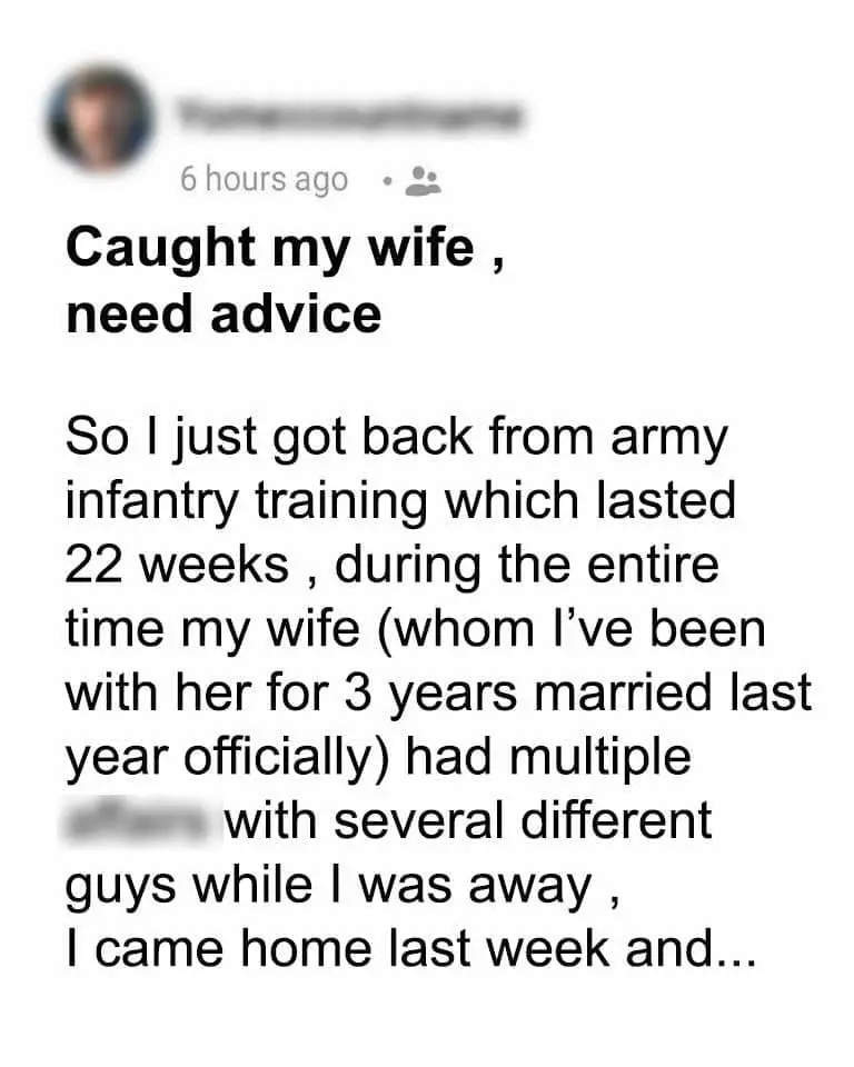 Coming back home after army infantry training, a man discovered terrible truth about his wife. He took to Reddit to seek for advice from the online community.