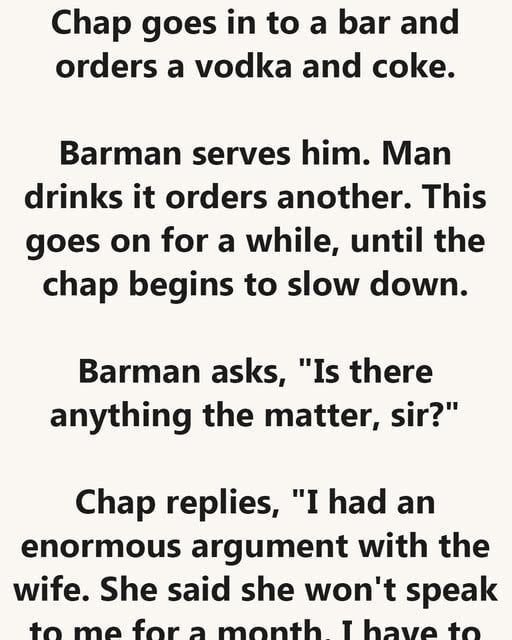 Chap replies, “I had an enormous argument with the wife. She said she won’t speak to me for a month.
