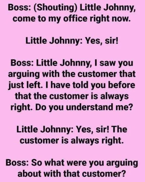Boss: (Shouting) Little Johnny, come to my office immediately.Little Johnny: Yes, sir! Boss: Little Johnny, I noticed you arguing with the customer who just left. I’ve told you before that the customer is always right.