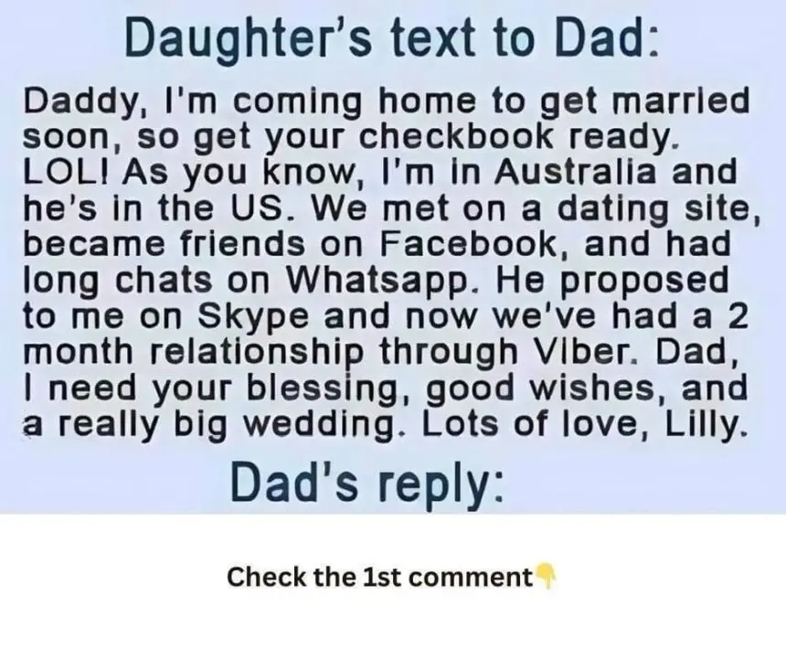 Daughter’s text to Dad: Daddy, I’m coming home to get married soon, so get your checkbook ready. LOL!