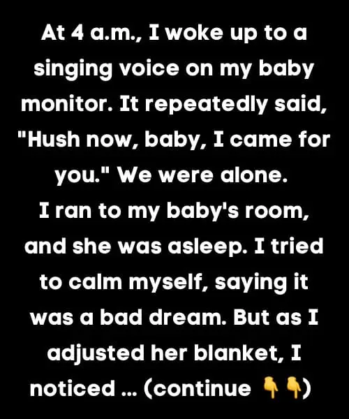At 4 a.m., I heard a singing voice on my baby monitor. It kept saying, “Hush now, baby, I came for you.” We were alone.