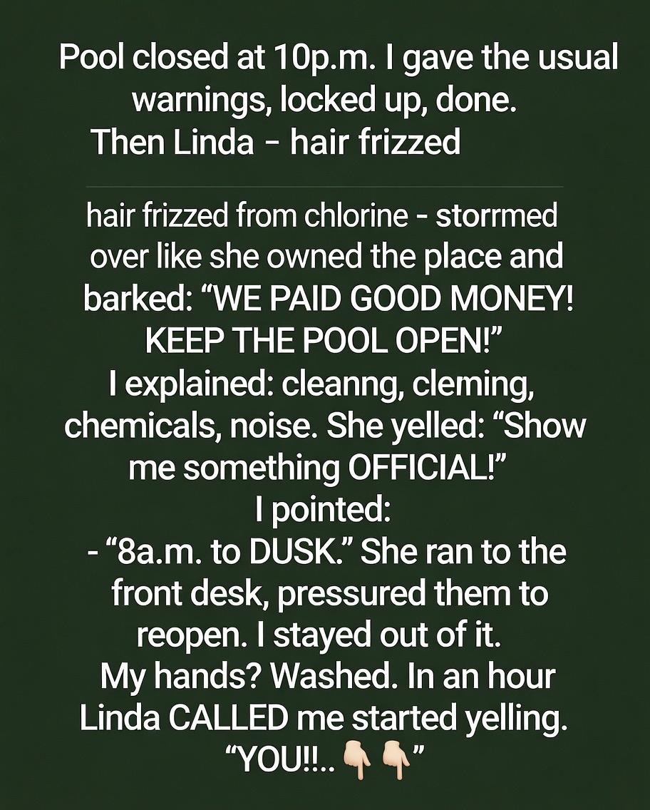 I was two hours past my shift, waiting for maintenance to finish a pool filtration repair, when Linda arrived—loud, barefoot, and dragging two dripping kids. “We paid good money! Keep the pool open!” she demanded.