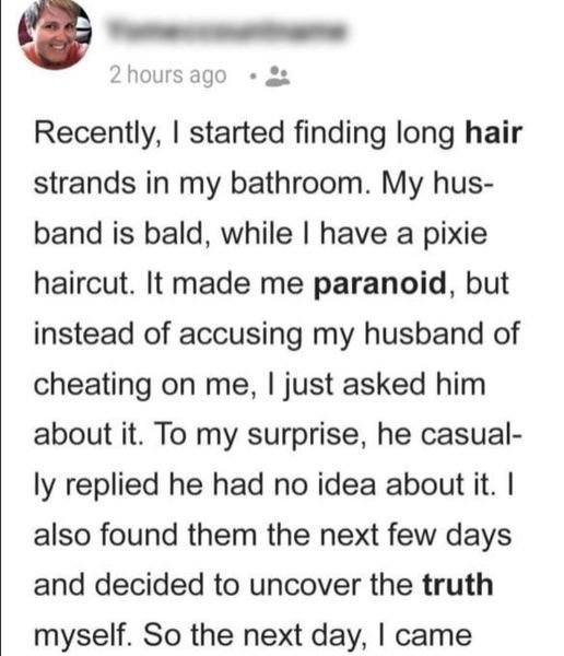 He shrugged and said he had no idea where the hair came from. His relaxed tone eased my mind a little, but when the strands appeared again over the next few days, I knew I had to get to the truth.Determined to solve the mystery, I paid close attention to everything happening in the house. Then one afternoon, as sunlight streamed through the bathroom window,