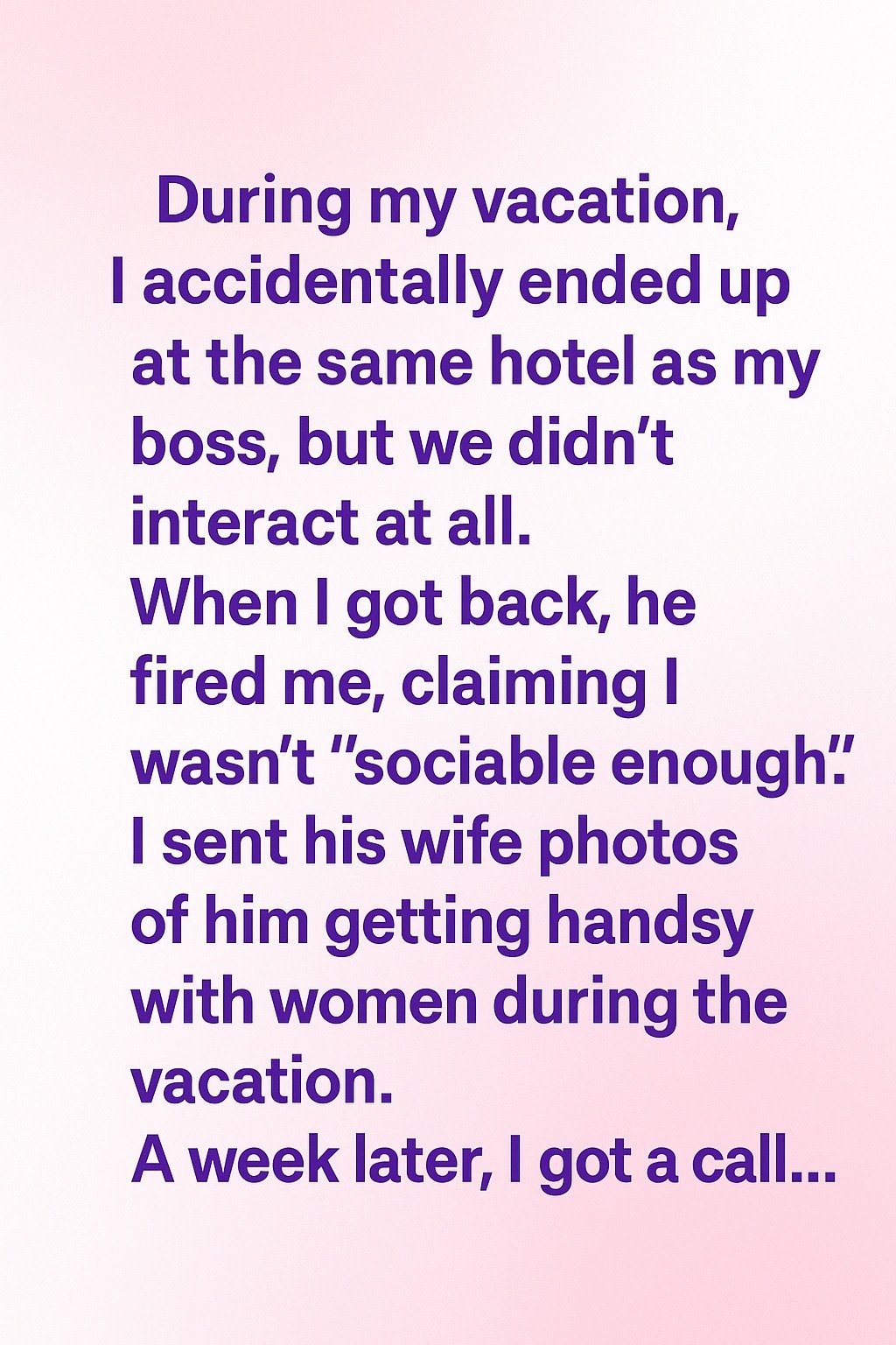 My boss called me into his office and abruptly fired me. His reason? He claimed I “wasn’t sociable enough” during the trip.