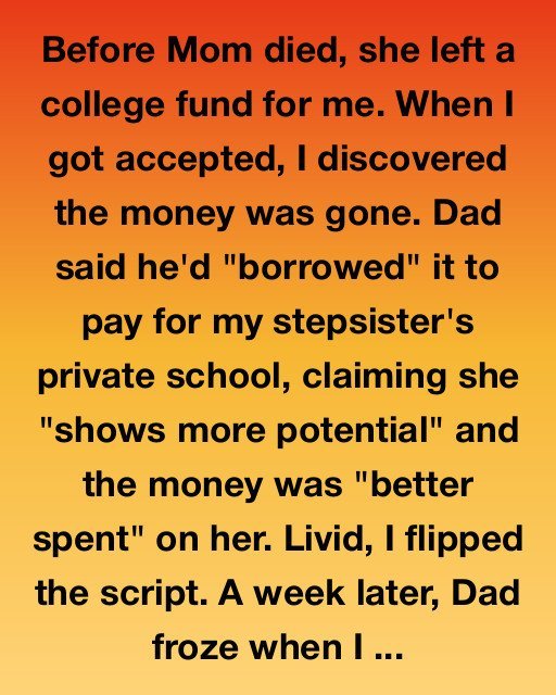 Before Mom died, she left a college fund for me. When I got accepted, I discovered the money was gone. Dad said he’d “borrowed” it to pay for my stepsister’s private school, claiming she “shows more potential” and the money was “better spent” on her.