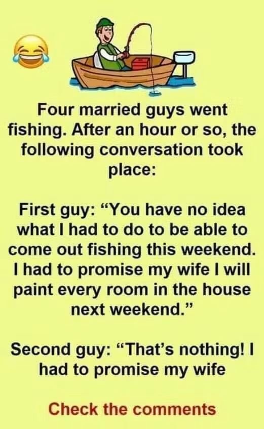 Four married friends—Bill, Tom, Jerry, and Frank—decided to take a much-needed fishing trip together. Between work, family, and the endless to-do lists of married life, the thought of one peaceful day on the water felt like paradise. As they cast their lines into the quiet lake, the gentle ripples of water soon gave way to laughter and stories about what it took for each of them to earn this rare escape.