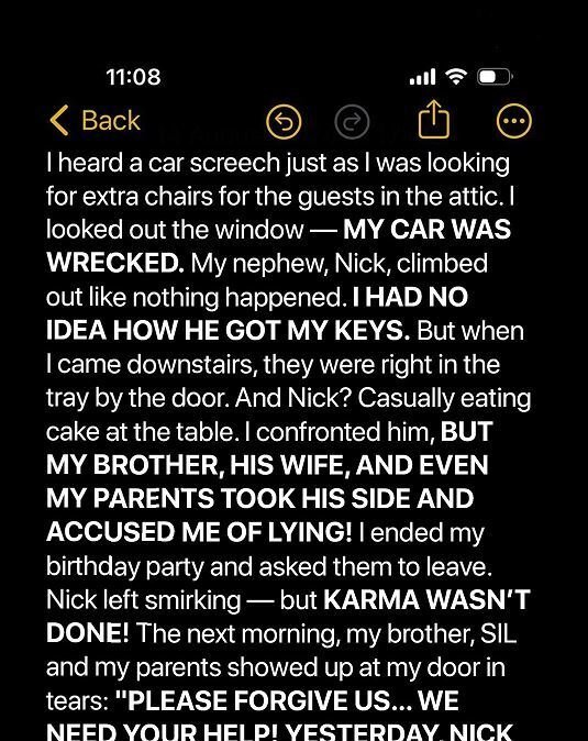 I was in the attic, pulling out extra chairs for my birthday dinner, when I heard the unmistakable screech of tires. My stomach sank. I rushed to the window—my car was wrecked.