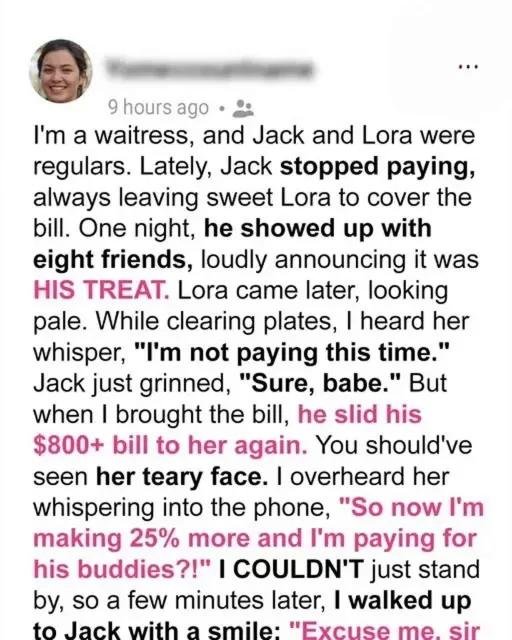 That night, Lora arrived late, looking exhausted. Jack barely acknowledged her and ordered like a king. When the bill came, Lora quietly refused.