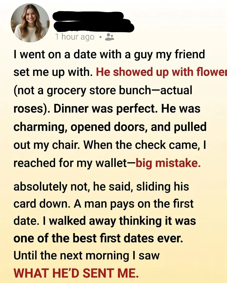 When Eric insisted on paying for everything—roses, a thoughtful gift, a perfect dinner—I thought I’d just had the best first date of my life. He checked every box: charming, attentive, confident. I went to bed smiling… completely unaware that the next morning, one message would flip everything upside down.