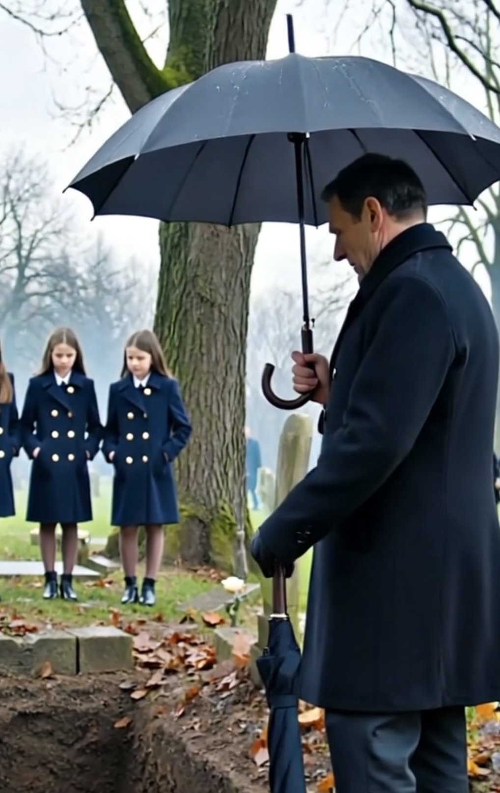 That’s when he saw them. Near the edge of the cemetery—half-hidden behind an oak—stood three identical little girls, about eight years old. Auburn ponytails.