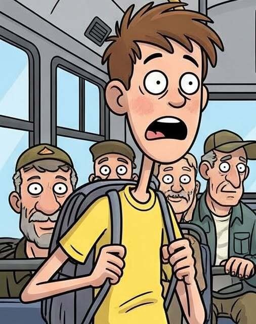 Henry mistakenly gets on a bus full of veterans, but upon discovering it is going his way, decides to stay on for the ride. He sits down next to a guy that jerks his head to the left every few seconds, over and over. This really bothers Henry so he asks him, “What’s wrong with you?”