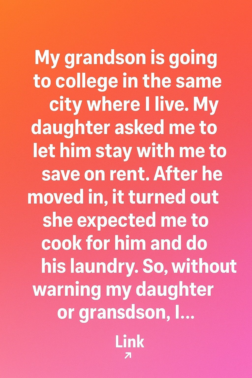 When my grandson got accepted into a college in the same city where I live, my daughter suggested that he stay with me to save on rent. I agreed because I was happy to help and thought it would give me a chance to spend more time with him.However, after he moved in, I quickly realized that my daughter had a different idea of what this arrangement would look like. She expected me to cook his meals, do his laundry, and essentially take care of him as though he were still a child.