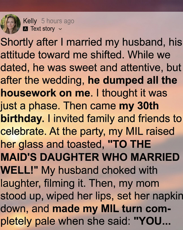 Instead, the party became an unexpected turning point. My mother-in-law raised her glass with a smile that didn’t quite reach her eyes and toasted, “To the maid’s daughter who married well!” Laughter followed from a few guests, including my husband, who even pulled out his phone to record the moment. The words landed like a stone in my chest—heavy, humiliating, and revealing more than she perhaps intended.