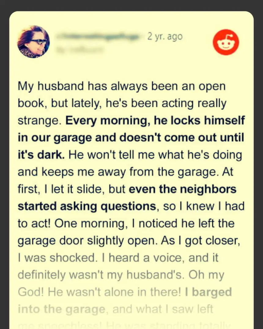 So Cheryl discreetly followed Frank that night, thinking how he wasn’t the same man she’d married. He would get home, eat, and rush to the garage most nights, returning at odd hours. Once, she thought she caught a whiff of a woman’s perfume when he got in bed.