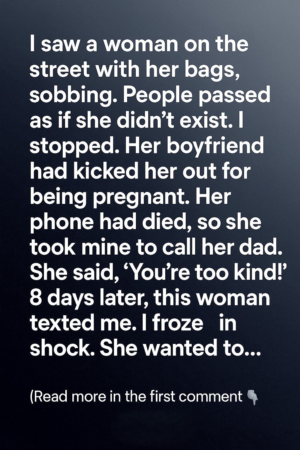 I was walking home from work on a gray, tired evening when I saw her—standing near the bus stop with two stuffed grocery bags at her feet, tears running down her face like she was trying to breathe through heartbreak. People streamed past her with that city-dazed focus, pretending not to see, pretending not to hear her soft sobs. I could’ve kept walking too.
