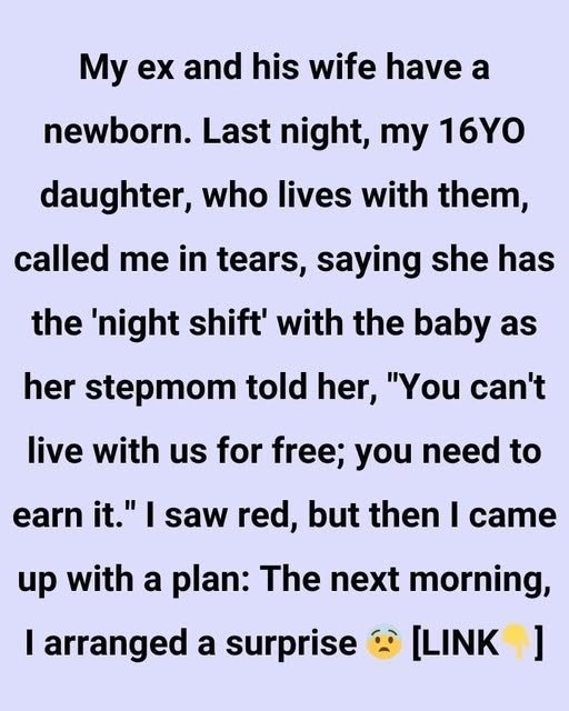 My ex and his wife have a newborn. Last night, my 16-year-old daughter, Sari, who lives with them part-time, called me in tears, saying she has the “night shift” with the baby. Apparently, her stepmom told her, “You can’t live with us for free; you need to earn it.”