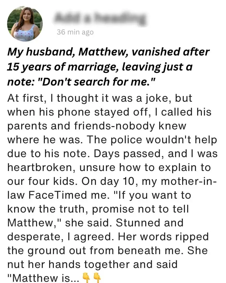 I tried to keep things normal for the kids, but it was a struggle. Every time they asked about their father, my heart broke a little more. Then, one day, I received a call from my mother-in-law.
