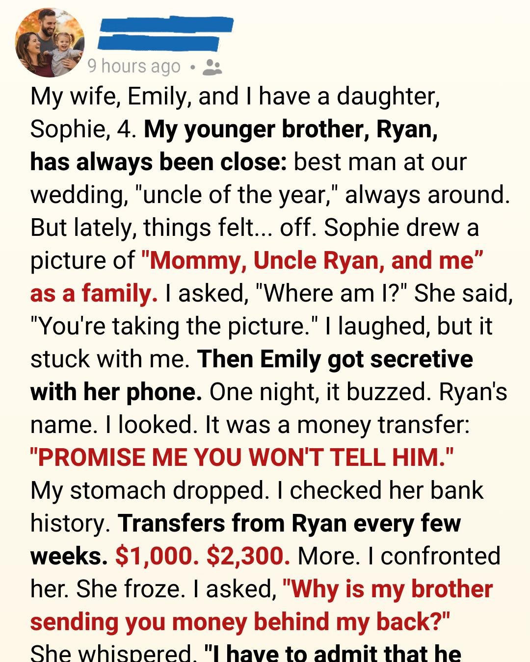 The relief washed over me—but the main question remained: why was Ryan sending Emily money? And why the secrecy? Then came Ryan’s birthday.