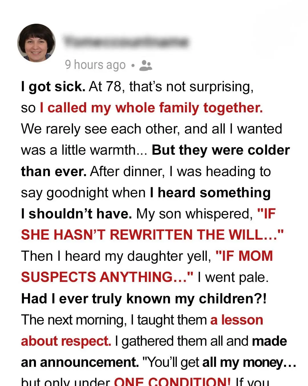 Yet, something in her words made me pause. My condition did require attention. But not medical attention. Family attention. If it were up to them, they wouldn’t have even asked if I was still breathing when I was taken to the hospital. But at that moment… Well, I could remind them of who I was.