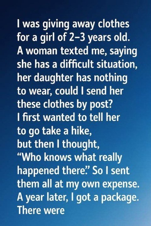 I had posted a small bundle of gently used clothes — outfits my daughter had outgrown, meant for a little girl around two or three. They were nothing fancy, just the things she once loved to twirl in, the warm layers she wore on cold mornings, and a few sweaters that still held memories for me. One afternoon, I received a message from a woman I didn’t know.