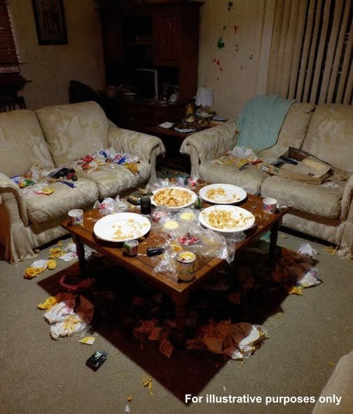 Fast-food wrappers littered the floor. Greasy takeout containers sat open, with half-eaten burgers oozing sauce. Soda cans were scattered everywhere, and someone had crushed chips into the carpet.