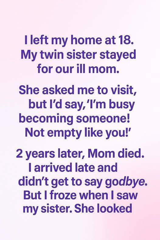 Not empty like you!” For years, I believed success only lived outside our small town, far from the quiet life my sister chose. She spent her days caring for Mom, while I chased opportunities, convinced that love and responsibility could wait. Two years later, Mom died.