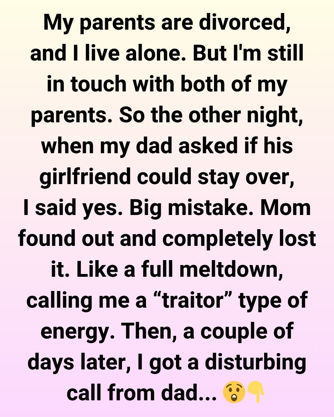 Anyway, my dad recently asked if his girlfriend, who my mom obviously despises just by existing, could stay at my place while she was in town for some event. I figured it was no big deal, I’m an adult, it’s my space, and I wanted to be cool about it. So I said yes.