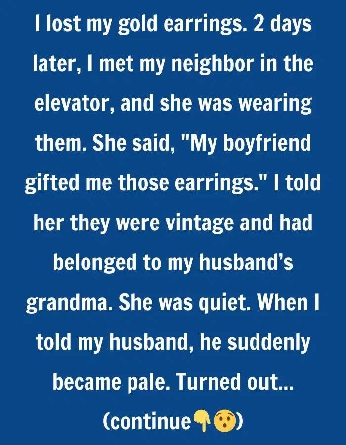 I lost my gold earrings. Two days later, I met my neighbor in the elevator, and she was wearing them.