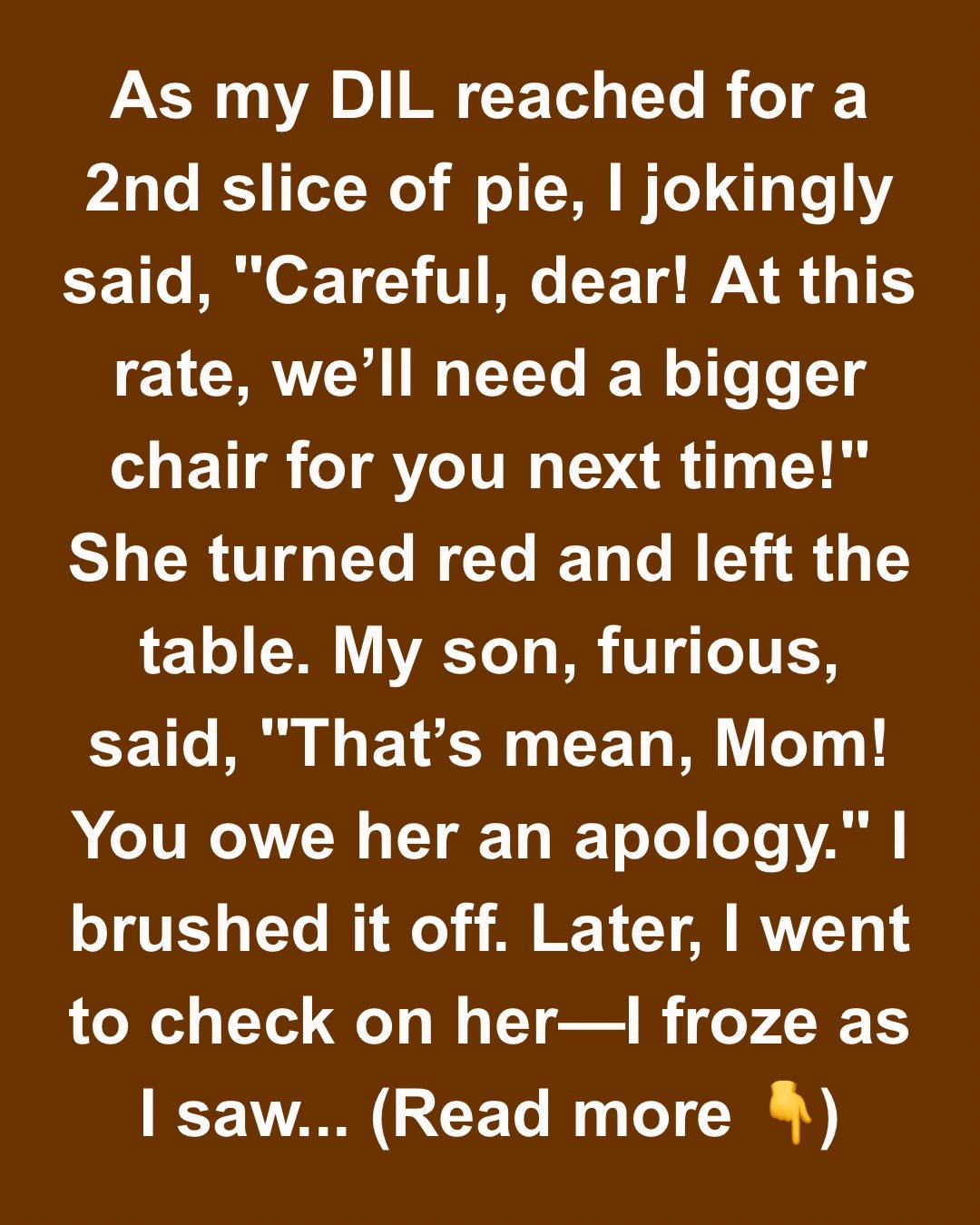 While we were enjoying dessert, I noticed Carla helping herself to a second slice of pie. Hoping to keep things light-hearted, I laughed and said, “Careful, honey.