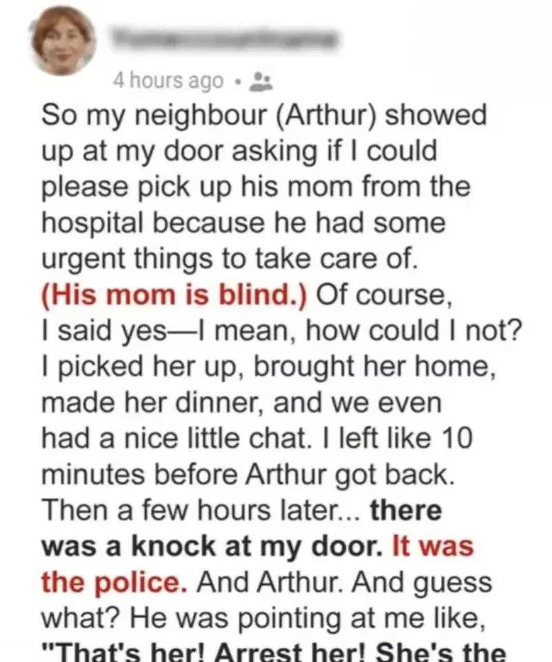 So my neighbor Arthur showed up at my door asking if I could please pick up his mom from the hospital because he had some urgent things to take care of. His mom is blind. Of course, I said yes—I mean, how could I not? I picked her up, brought her home, made her dinner, and we even had a nice little chat. I left like ten minutes before Arthur got back.
