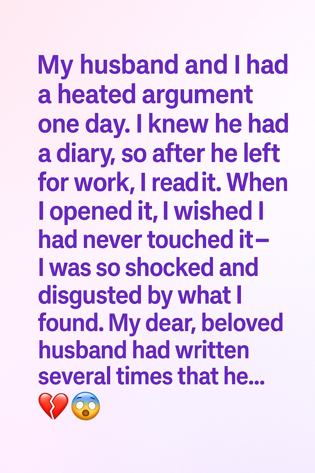 I knew he kept a diary tucked away in his nightstand. My curiosity and hurt got the better of me, and I decided to read it, hoping to understand what he was feeling. As I opened the diary, my hands trembled.