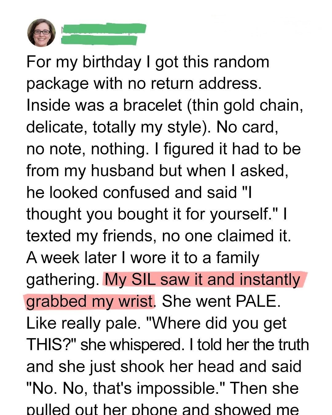 A week later, at a family dinner, my sister-in-law Emma saw the bracelet on my wrist and went ghostly pale. She reached across the table and whispered, “Where did you get THIS?” Her reaction startled everyone. I told her it arrived anonymously.