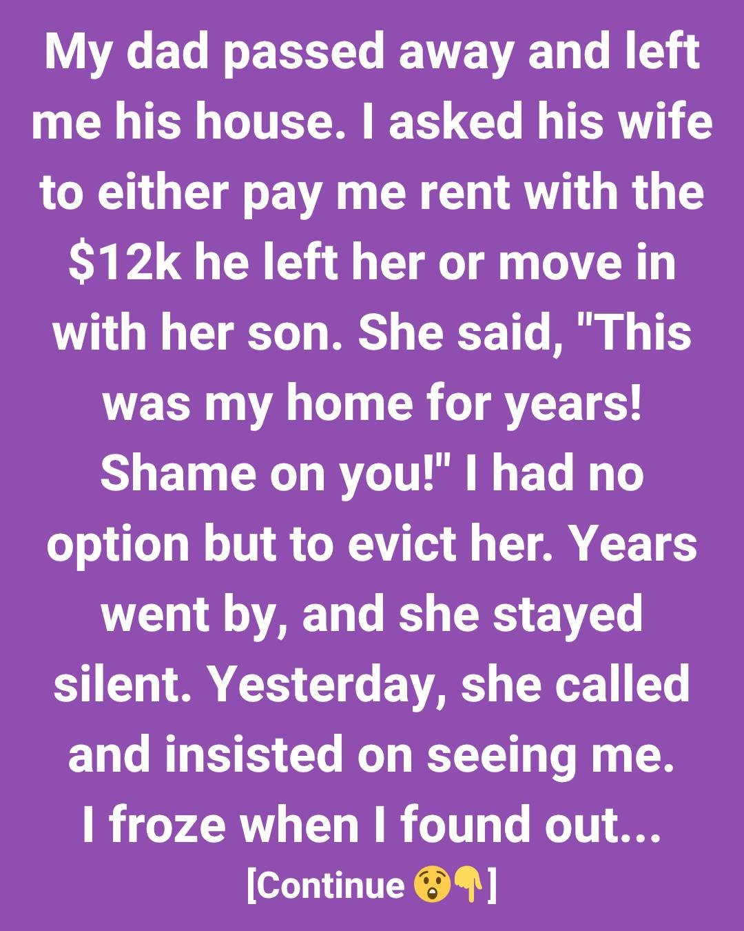 Yesterday, she called and insisted on seeing me. I froze when I found out that the new, small apartment she was living in was bought by my dad. She said he used the rest of his savings to buy it for her before he died, so she’d have a safe place if she was ever kicked out.