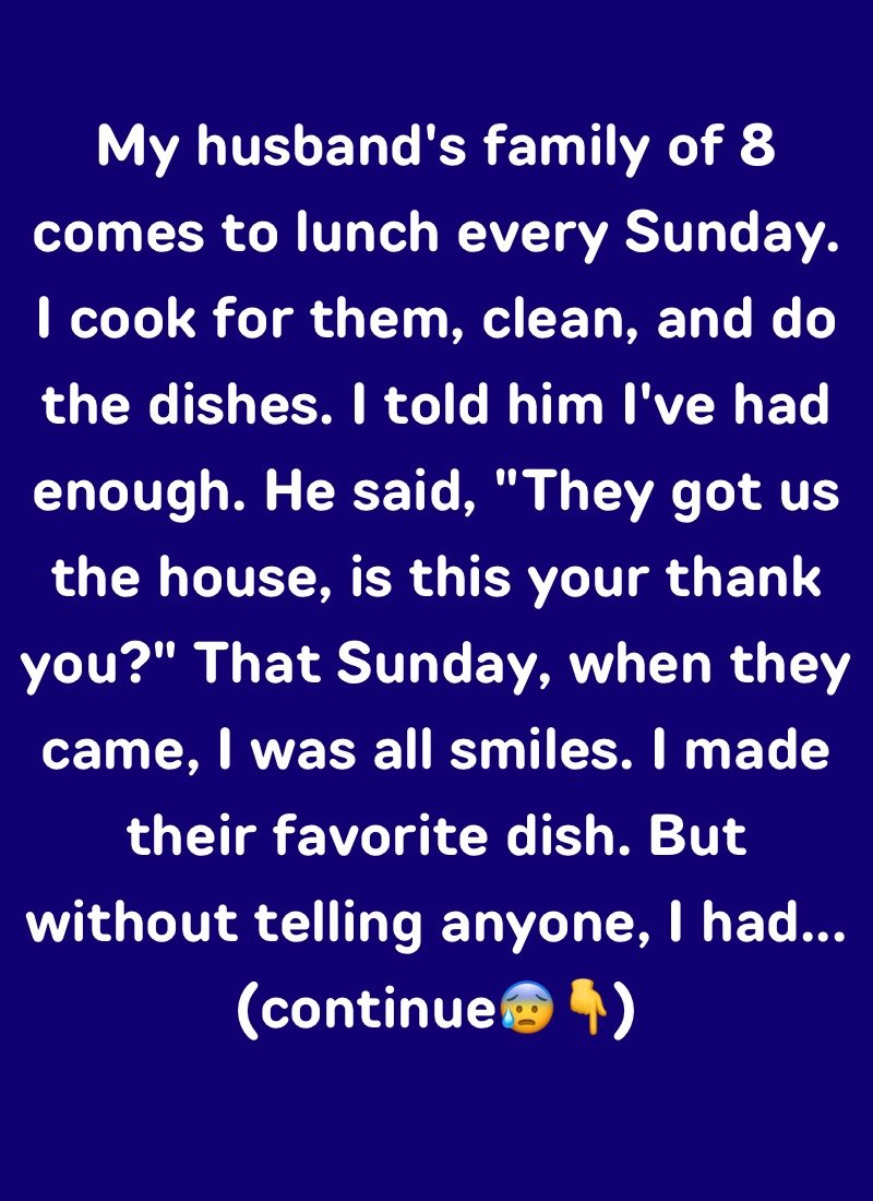 But ever since we moved, my husband’s family of 8 comes to lunch every Sunday. They say that the house is big and could fit us all. I cook for them, clean and do the dishes. Not once has anyone stepped into the kitchen to help.