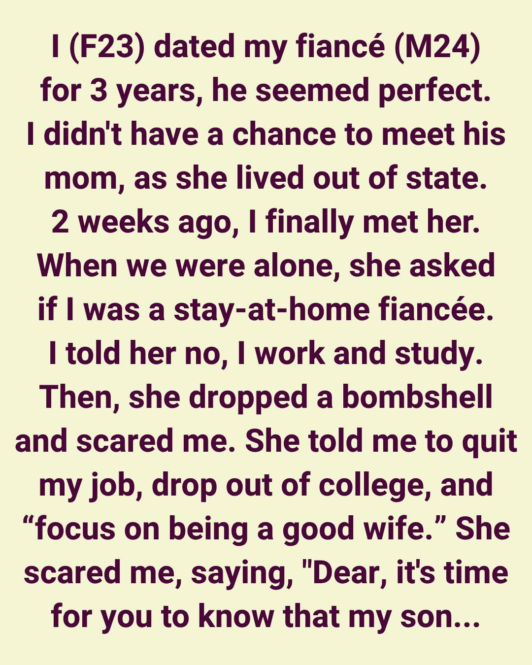 I told her no—I work and study. Then she dropped a bombshell that genuinely scared me. She told me I needed to quit my job, drop out of college, and “focus on being a good wife.”