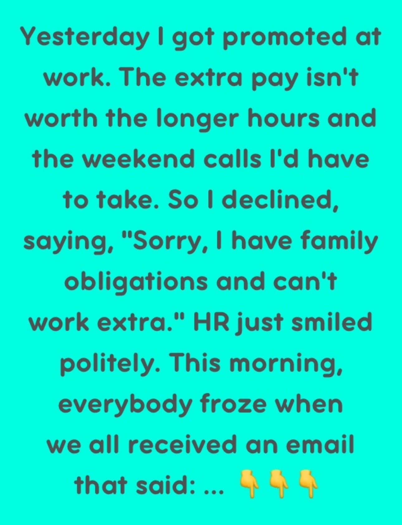 So I declined, saying, “Sorry, I have family obligations and cannot work extra.” HR just smiled politely. This morning, imagine my surprise when I came to the office and found a big sign on the wall—a slogan that said, “Treat your work as your family!”