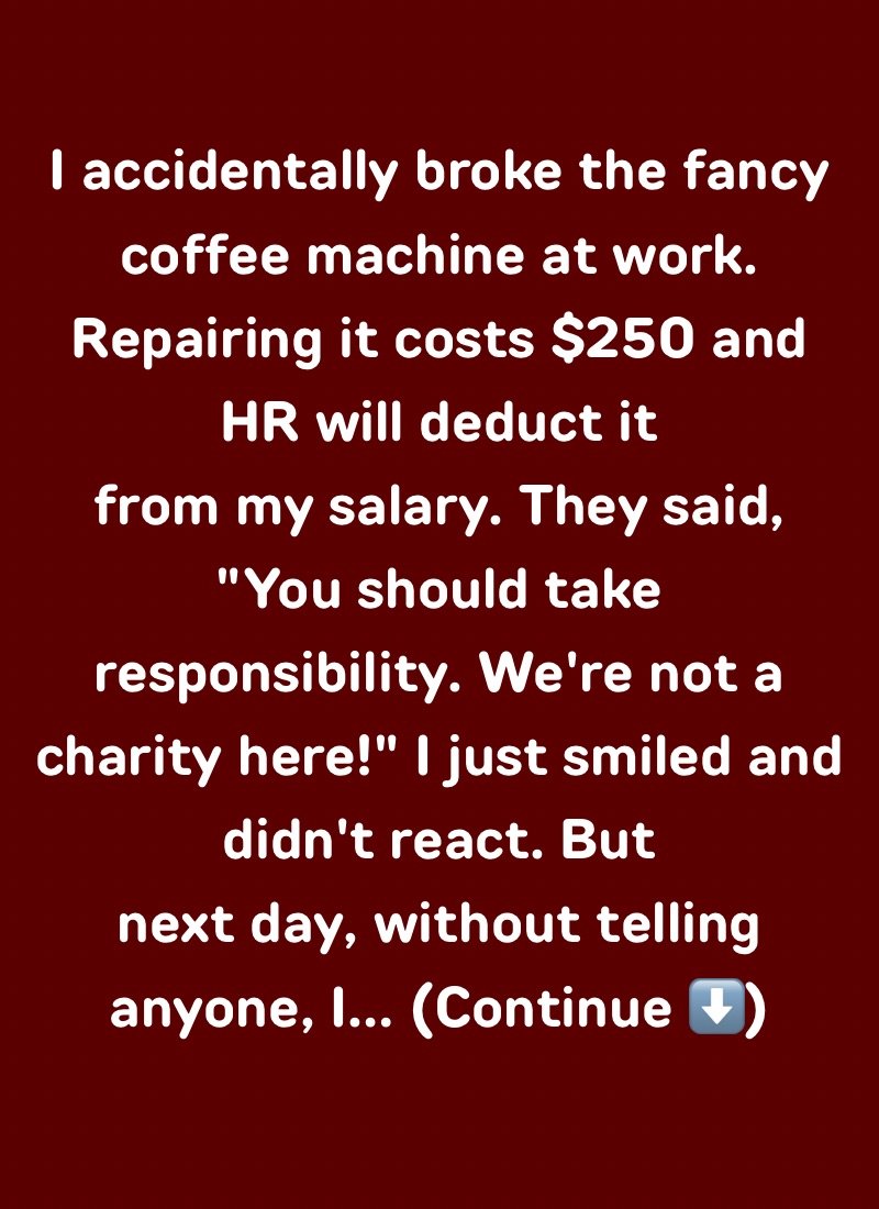 I work at a consulting company with about 20 employees. The other day, I accidentally broke our fancy Italian coffee machine while making a cappuccino. The repair cost was $250, and HR told me they’d take it out of my salary.