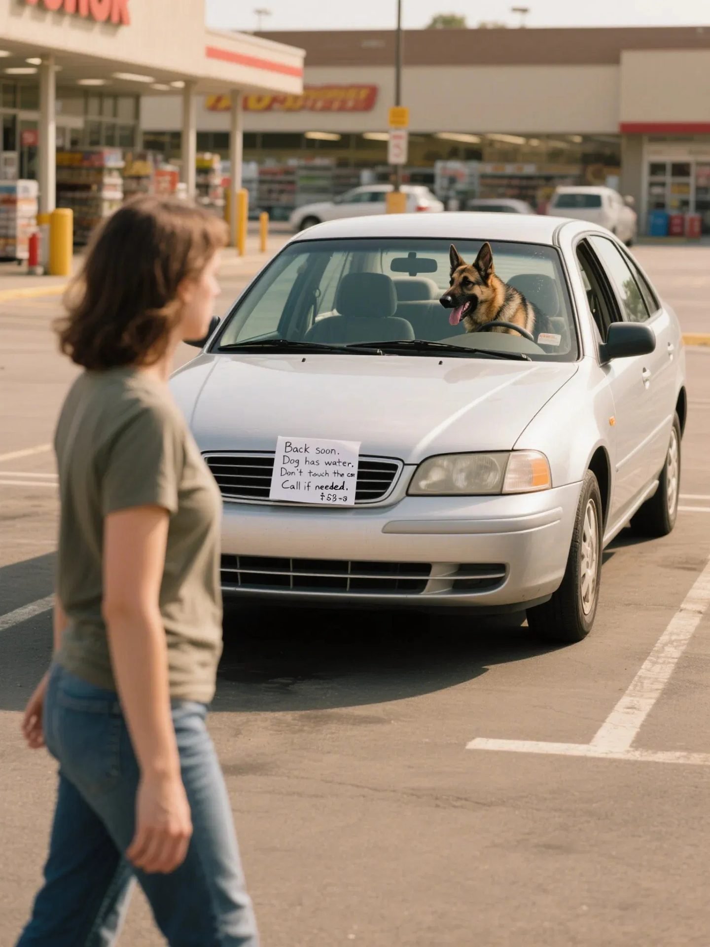 “Return soon. Pet has water. Avoid touching the automobile. Call if needed.”
