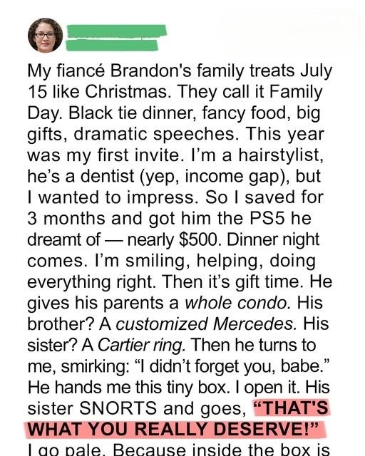 I was thrilled my fiancé invited me to his wealthy, tight-knit family’s extravagant “Family Day” celebration. They go all out, so I spent months saving for Brandon’s dream gift. But when gift-giving time came, Brandon handed me a tiny box… and a public humiliation I never saw coming.