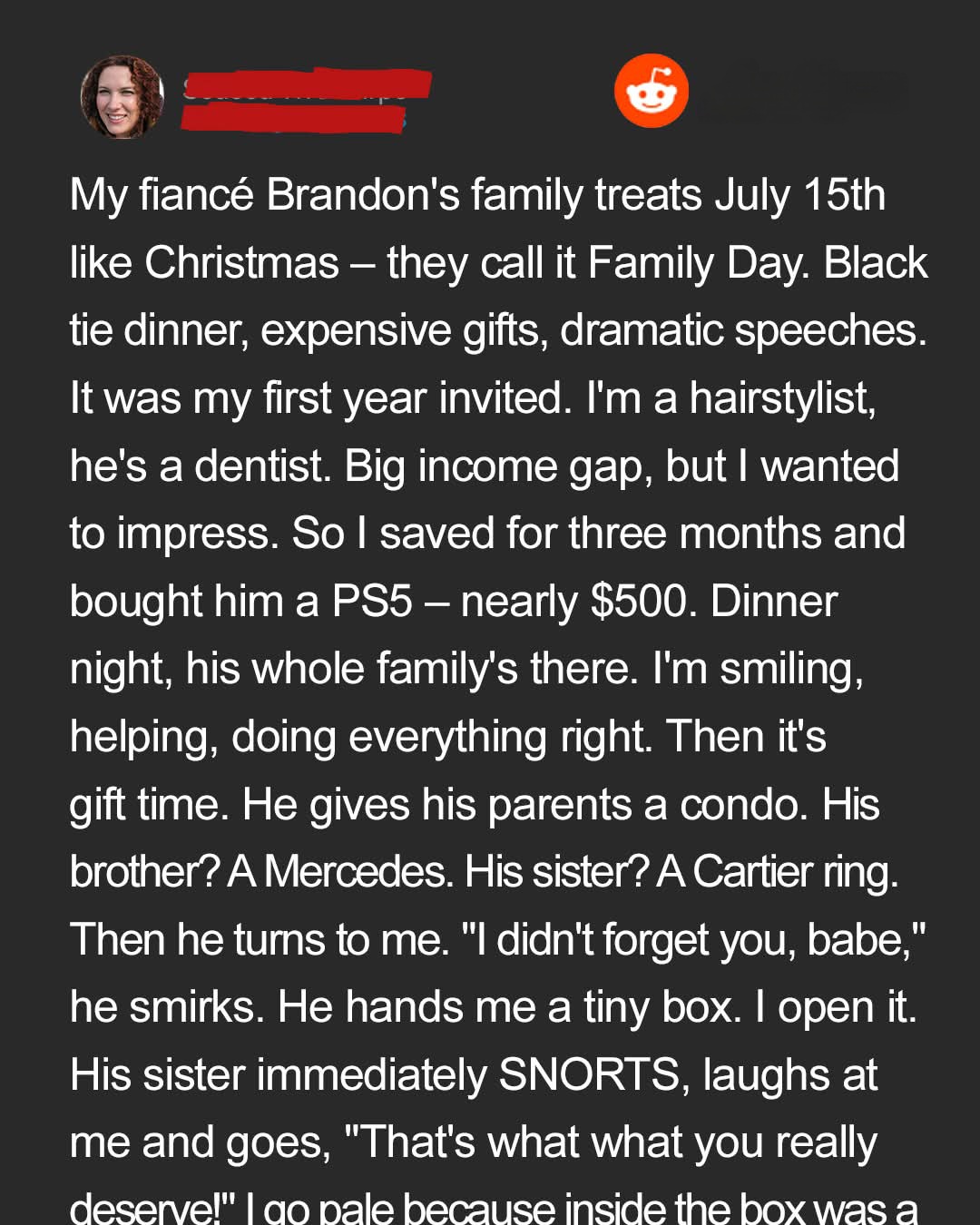 I was thrilled my fiancé invited me to his wealthy, tight-knit family’s extravagant “Family Day” celebration. They go all out, so I spent months saving for Brandon’s dream gift. But when gift-giving time came, Brandon handed me a tiny box… and a public humiliation I never saw coming.