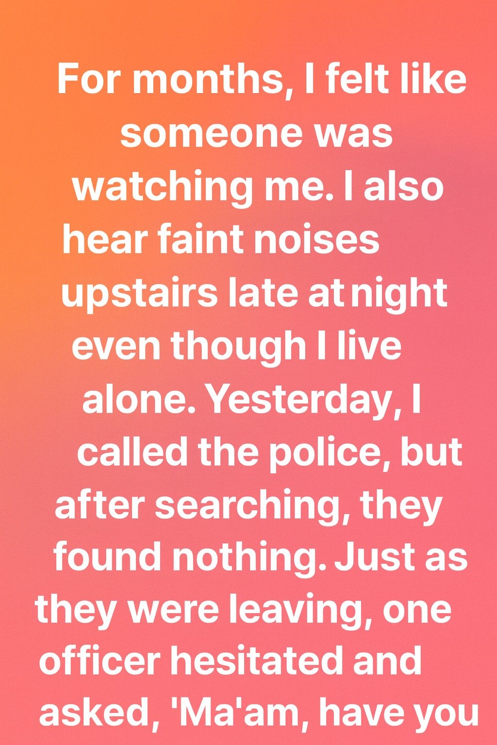 For months, I felt like someone was watching me. I also heard faint noises upstairs late at night, even though I lived alone. Yesterday, I finally called the police.