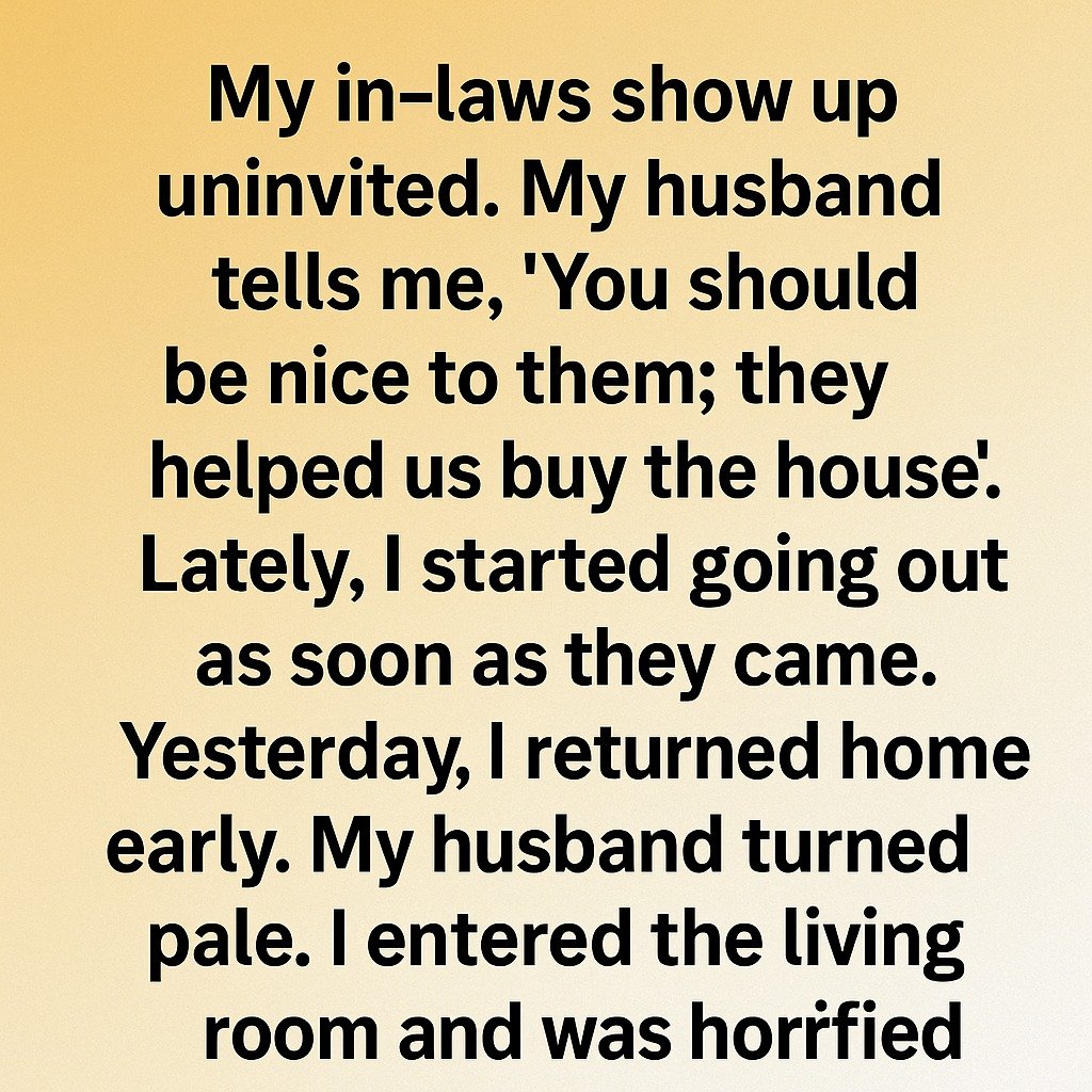 My in-laws show up uninvited. My husband tells me, ‘You should be nice to them; they helped us buy the house.’ Lately, I started going out as soon as they came. Yesterday, I returned home early.