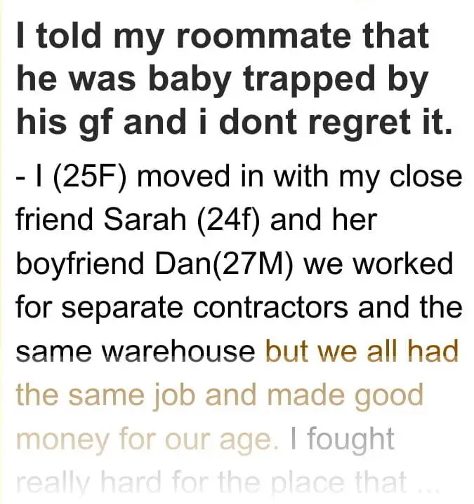I (25F) moved in with my close friend Sarah (24f) and her boyfriend Dan(27M) we worked for separate contractors and the same warehouse but we all had the same job and made good money for our age.