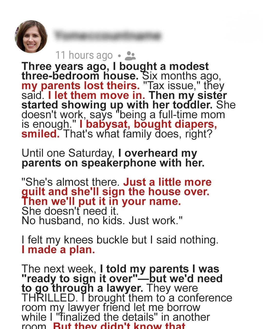 So I played along. I told them I’d sign the house over, scheduled a meeting with a lawyer friend, and invited Claire.