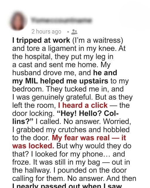 I tripped at work (I’m a waitress) and tore a ligament in my knee. At the hospital, they put my leg in a cast and sent me home. My husband drove me, and he and my MIL helped me upstairs to my bedroom. They tucked me in, and I was genuinely grateful. But as they left the room, I heard a click—the door locking. “Hey! Hello? Col-lins?” I called. No answer. Worried, I grabbed my crutches and hobbled to the door. My fear was real; it was locked. But why would they do that? I looked for my phone…and froze. It was still in my bag—out in the hallway. I pounded on the door calling for them. No answer. And then I nearly passed out when I saw a shadow moving outside my window—a figure pacing like they were guarding me.