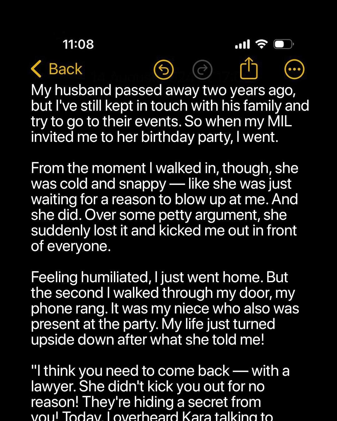 Melissa attended her late husband Mark’s mother Kara’s birthday party, hoping to honor Mark and his grandmother Eleanor’s memory. Kara had never been warm toward Melissa, and the evening was filled with subtle jabs and uncomfortable moments. Eventually, Kara’s hostility boiled over — she publicly told Melissa to leave, declaring she no longer belonged in the family.