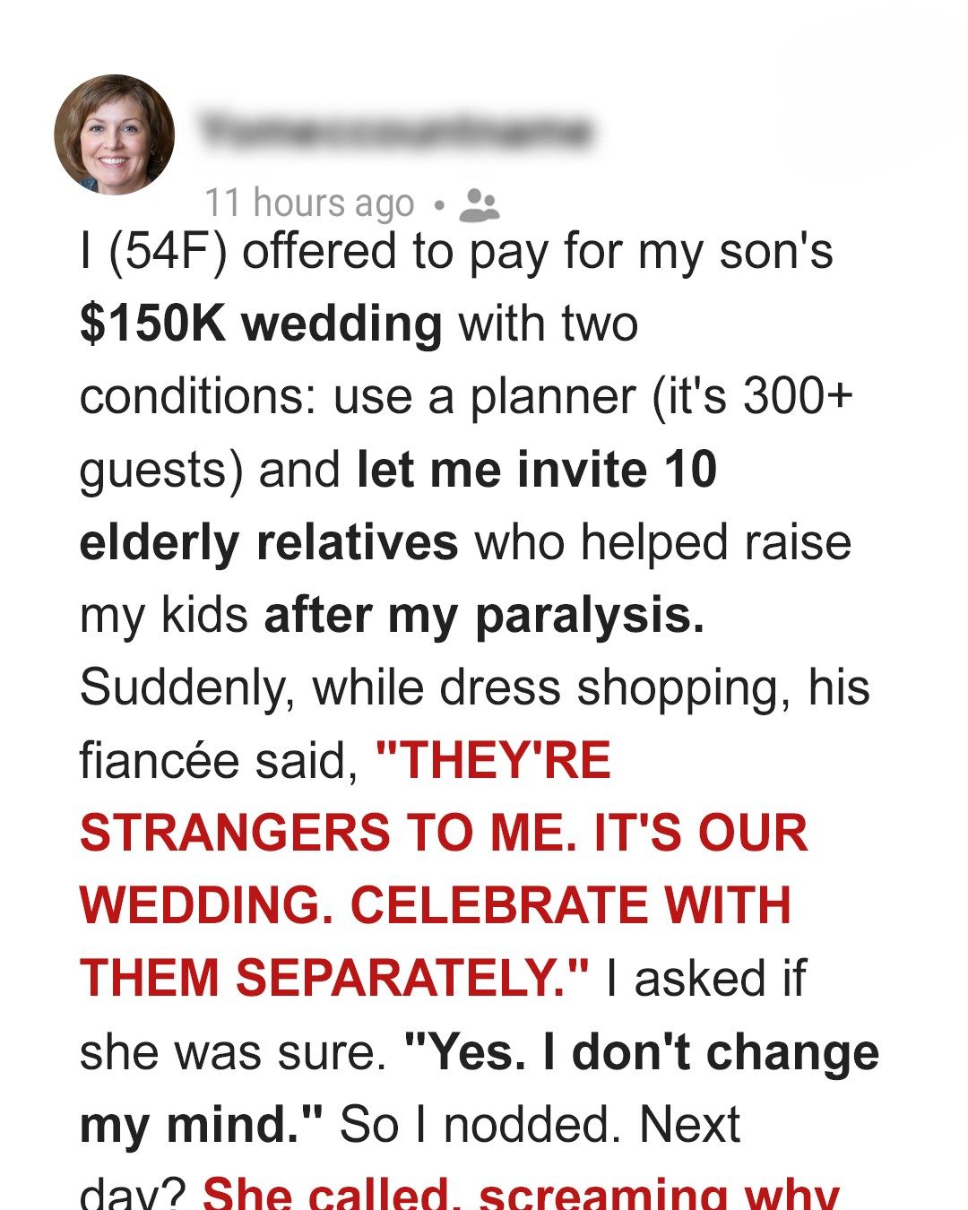 “I was covering the wedding because of my son,” I replied. “Not signing up to be treated like an ATM. You’re welcome to pay for whatever you’d like; that’s your prerogative. But I’m not investing in a day I’m not even allowed to fully be part of.”