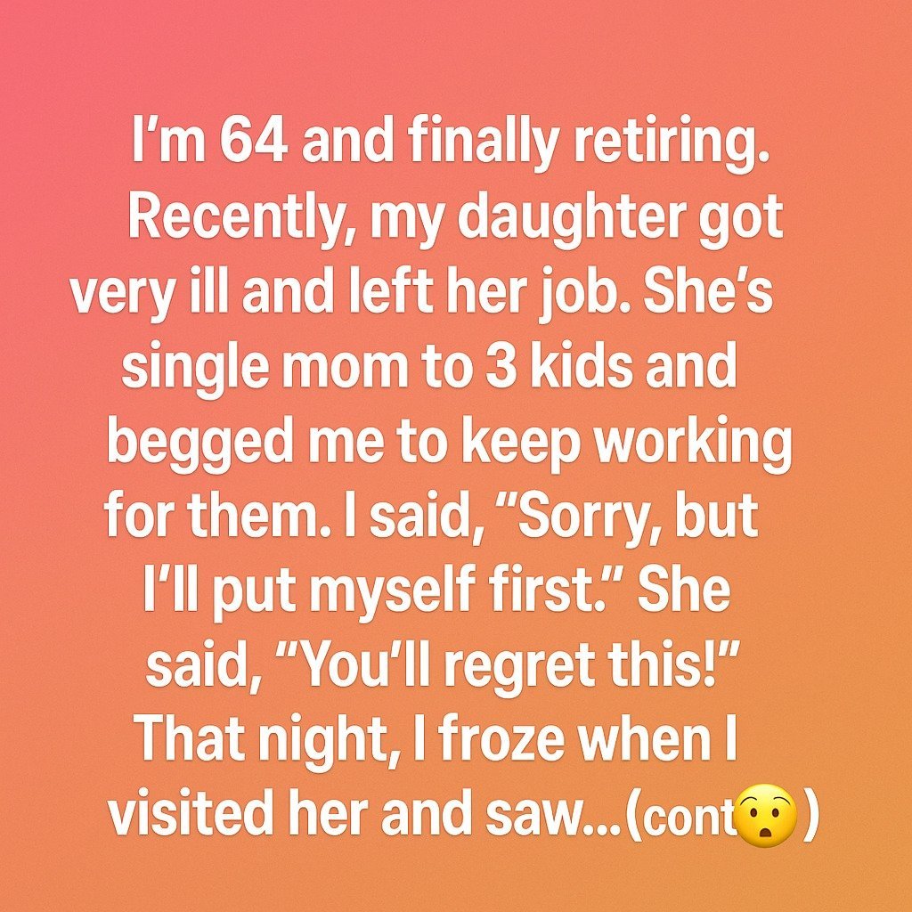 My daughter, a single mother of three, became very ill and had to leave her job. With tears in her eyes, she asked me to keep working a little longer to help her family. My heart ached, but I said, “I’m sorry, but this time I must put myself first.” Her reply cut deep: “You’ll regret this.”