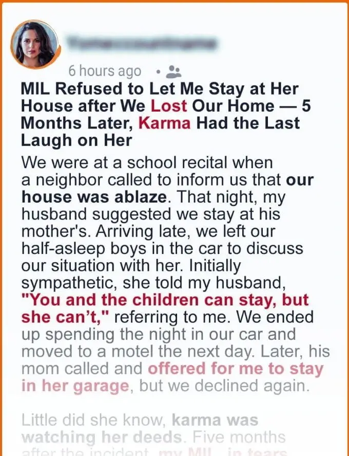Five months ago, my mother-in-law refused to let me stay at her house after a devastating fire destroyed our home. But when fate turned the tables on her an unexpected twist brought reconciliation to our family.